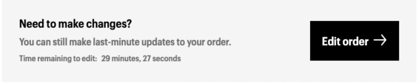 You can edit or cancel your order within 30 minutes of the order being placed. There will be an accessible "Edit order" button on the checkout page, and within your customer portal on the order. Example here: